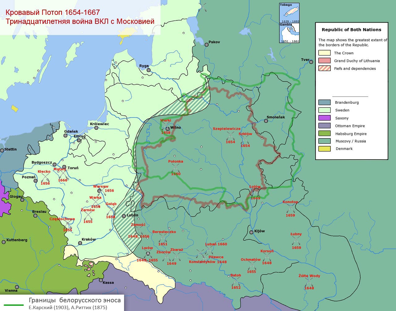 Кровавый Потоп — война с Москвой 1654-1667 годов. Самая кровопролитная война в истории Беларуси. Как великий гетман Литовский, Януш Радзивилл участвовал в первых боях под Шкловом и Шепелевичами, был ранен, едва не попал в плен. Местный житель провёл его через болота в Борисов, откуда Януш отступил в Минск, где собирал шляхетские отряды для продолжения борьбы.