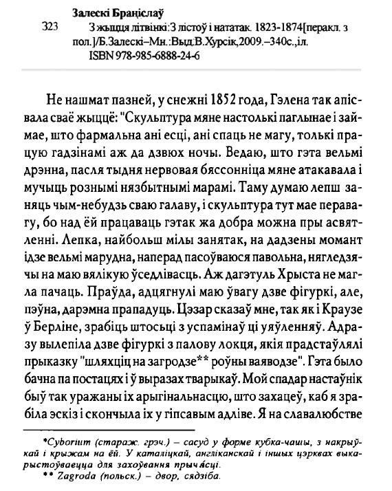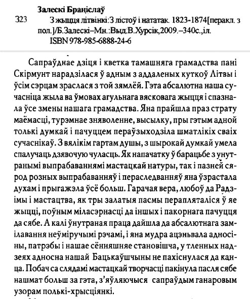 Подробная биография Хлены Скирмунт "З жыцьця літвінкі" была написана Залеским на основе ее писем и дневника. Книга, с подробностями передающая дух времени, во многом созвучна з "Каласы пад сярпом тваім" Караткевіча.