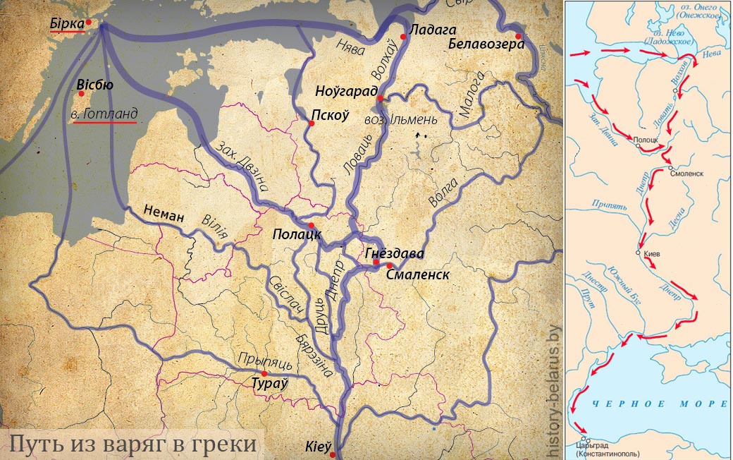 Из разных возможных маршрутов самым коротким был Балтика-Двина-Днепр, проходящий из Балтийского моря по Западной Двине через города Рига, Полоцк и Смоленск (в 5 раз короче, чем путь через Ладогу, описанный в ПВЛ). Возможно, часть пути на границе водоразделов Немана и Припяти, которую сегодня можно пройти лишь "волоком", проходила по Морю Геродота, отмечавшееся на картах до XVI века. В XVIII веке это путь, разорванный на месте бывшего моря, замкнул Огинский канал.