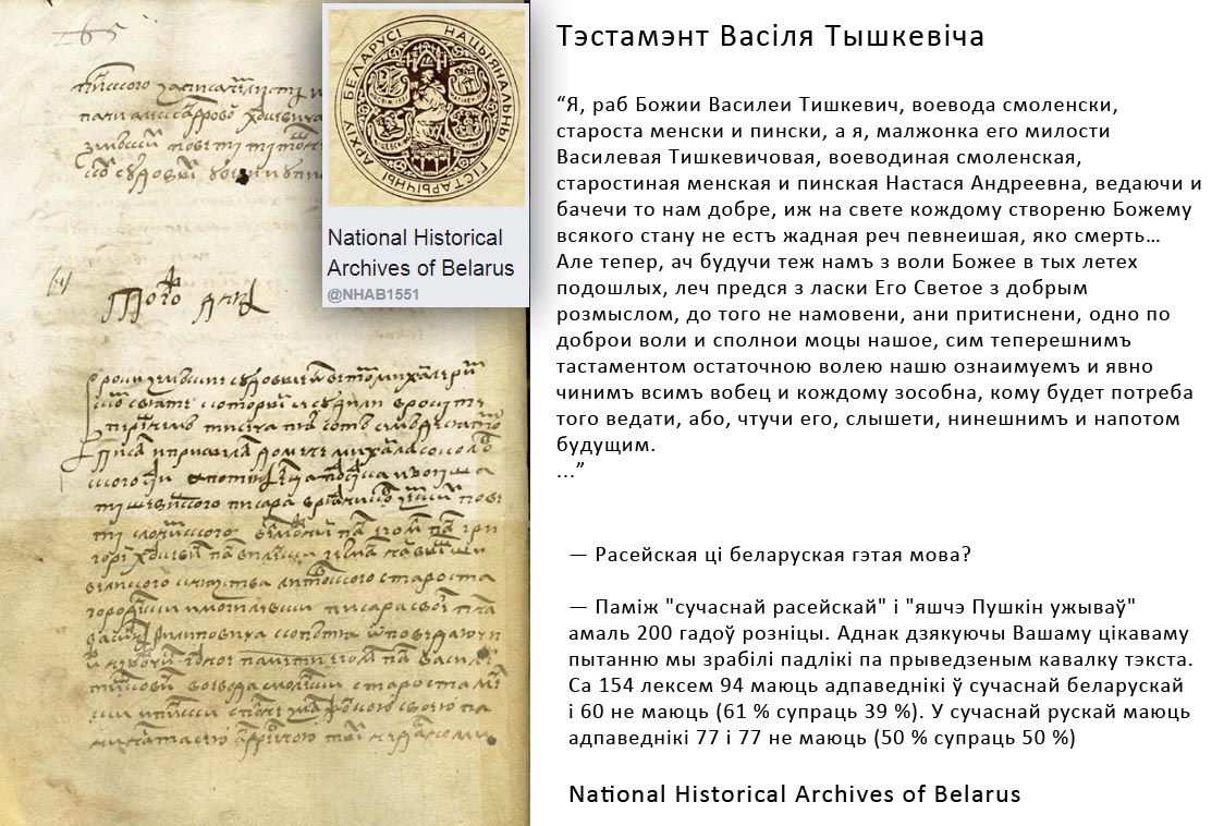 Интересен тэстамэнт Василя Тышкевича († 1571) — воеводы Подляского и Смоленского, старосты Минского и Пинского. Образец мовы XVI века с лингвистическим анализом от National Historical Archives of Belarus.