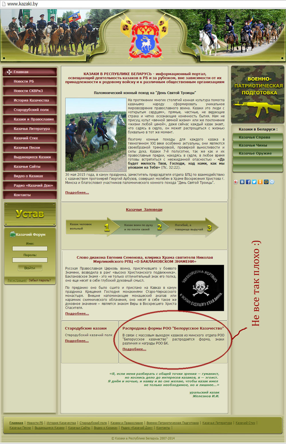 Даже в годы Второй Мировой войны, когда Донское и прочее казачество самоорганизовывалось на службу Третьего Рейха, в Беларуси этого не произошло — белорусское казачество существует только под патронажем восточного соседа. Даже сегодня на эмблеме белорусского казачества изображен двуглавый орел — герб чужого государства.