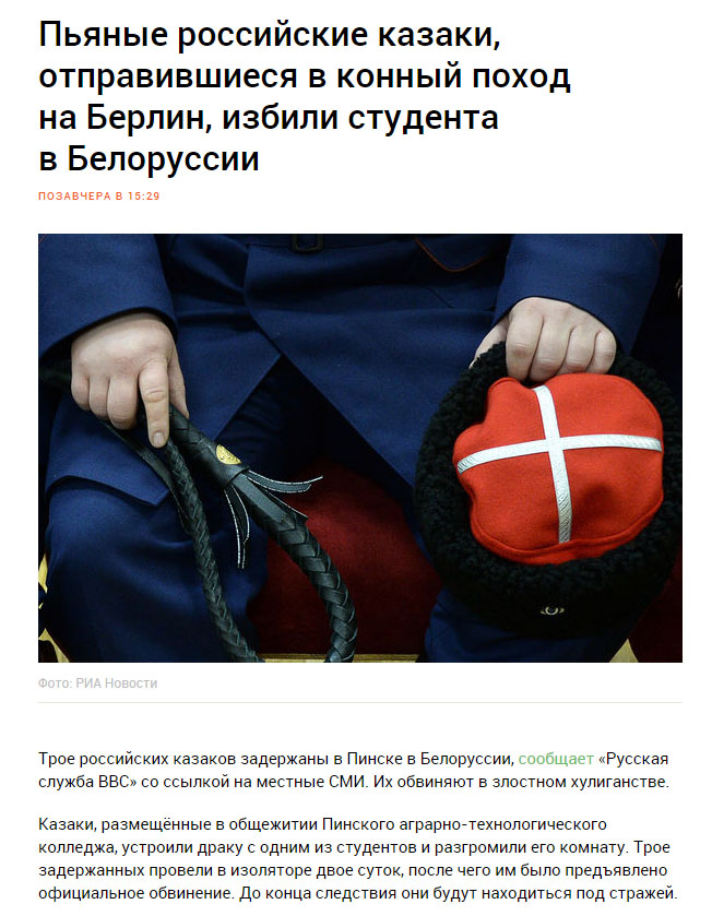 В общем исторический стереотип казака в Беларуси очень негативный. Даже наши украинские братья, украинские казаки, которые боролись за свою независимость в XVII веке, в Беларуси были оккупантами — эту страницу нашей истории не надо обходить. Казаки у нас убивали, грабили, жгли города. И само понятие «казак» в белорусском исторического сознания выступает как негативный термин».