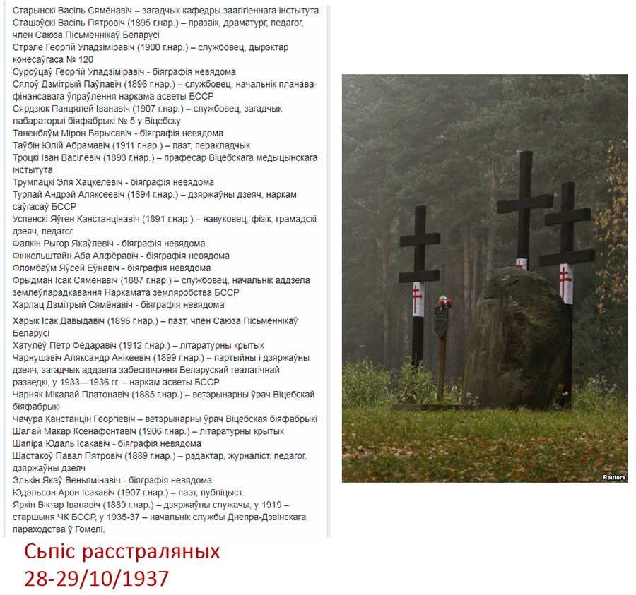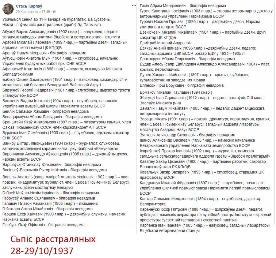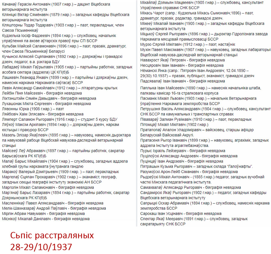 28-29 октября 1937 года по обвинению в участии в "антисоветской объединенной шпионско-террористической национал-фашистской организации" в подвалах минской тюрьмы НКВД было расстреляно более 100 белорусских писателей, поэтов, ученых, государственных деятелей.
