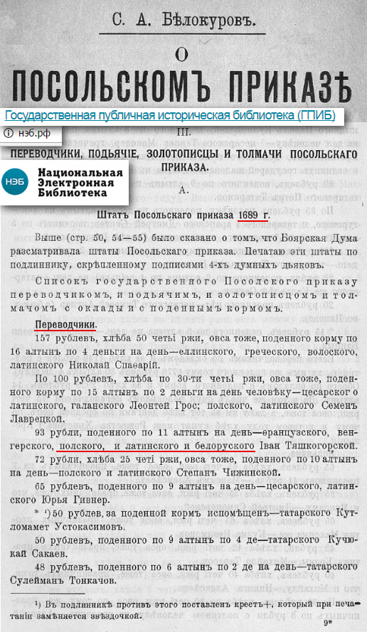 Пры ўсёй блытаніне з тэрмінамі «рускі», «беларускі», «літоўскі» у штаце Пасольскага загаду Маскоўскага царства 1689 году быў «перекладнік зь беларускае мовы» — гл. выданьні Нацыянальнае бібліятэкі РФ.