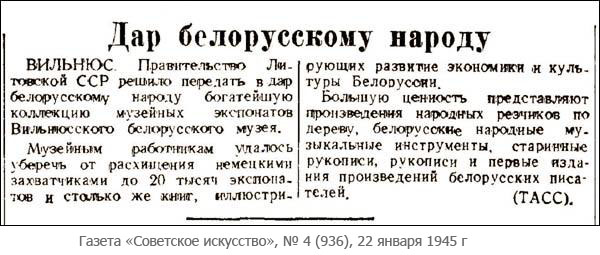 У 1944 годзе ўраднай камісіяй фонды музэю былі падзеленыя паміж ЛітССР і БССР. Улетку 1945 году зь Вільні ў Менск прыбыла першая значная партыя беларускіх каштоўнасьцяў. Большасьць экспанатаў «да лепшага часу» складавалі ў музэі гісторыі Вялікае Айчынае вайны.