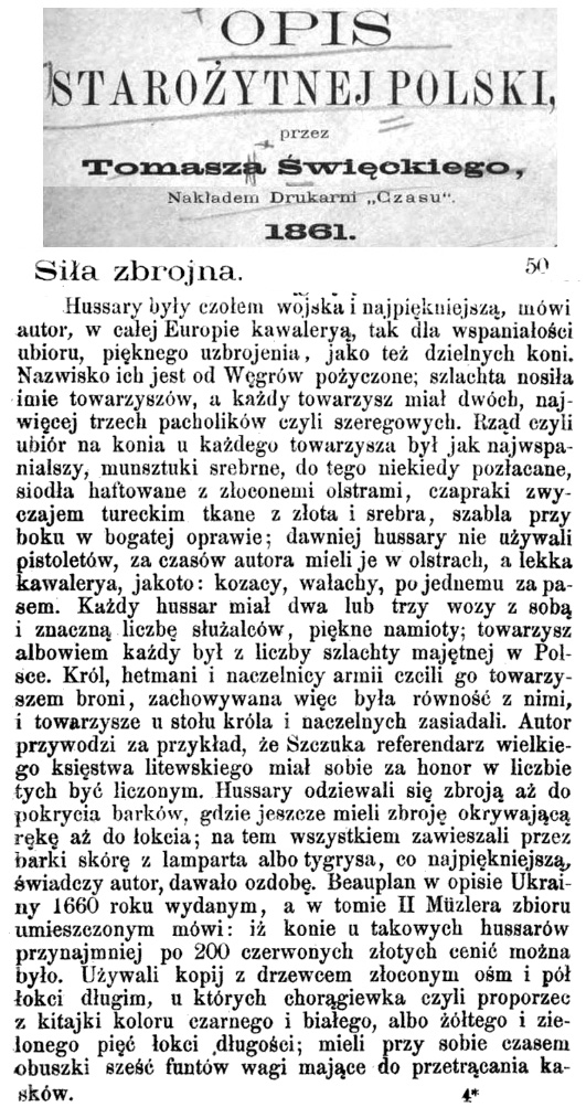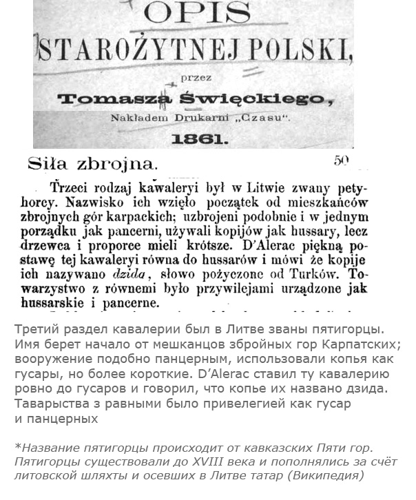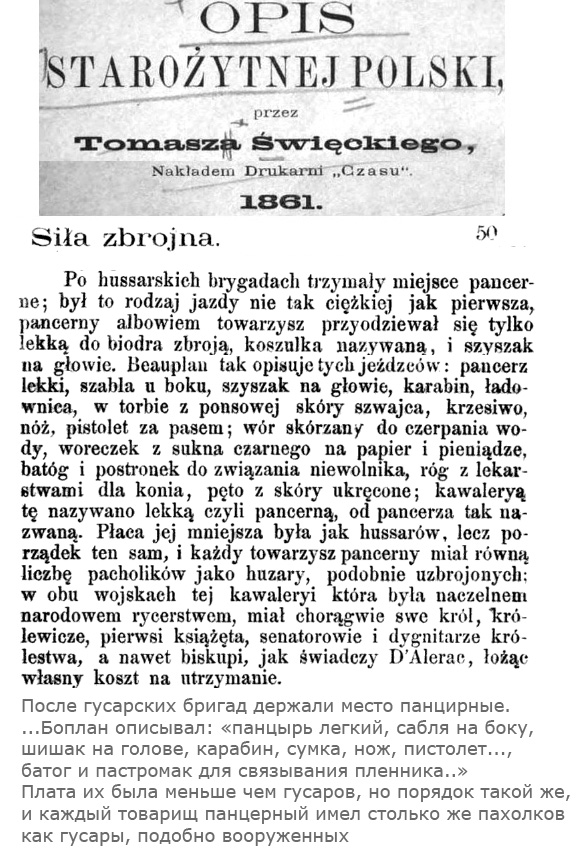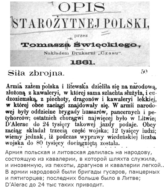 Коротко о составе армии Польши и ВКЛ (из Opis Starozytnej Polski) — "Армия польская и литовская делилась на народову, в которой шляхта служила, и иноземную, из пехоты драгунов и кавалерии легкой. В армии народовой были бригады гусар, панцерных и пятигорцев; последних больше было в Литве".
