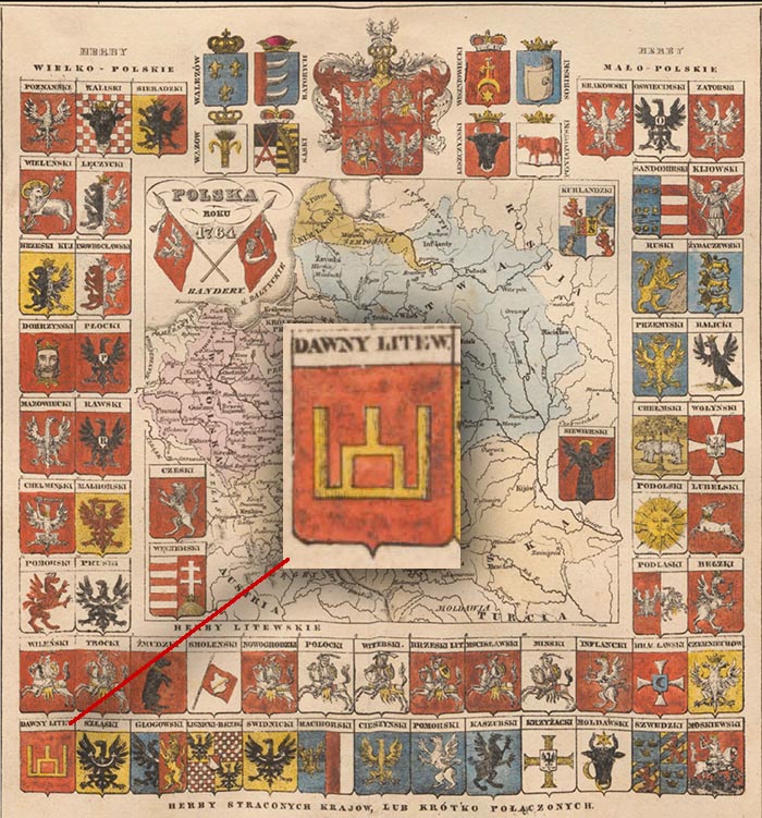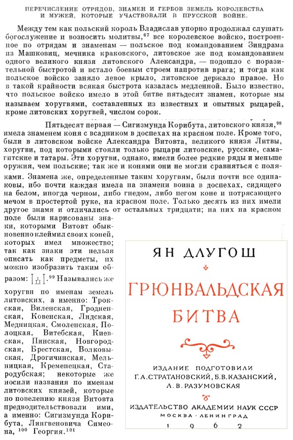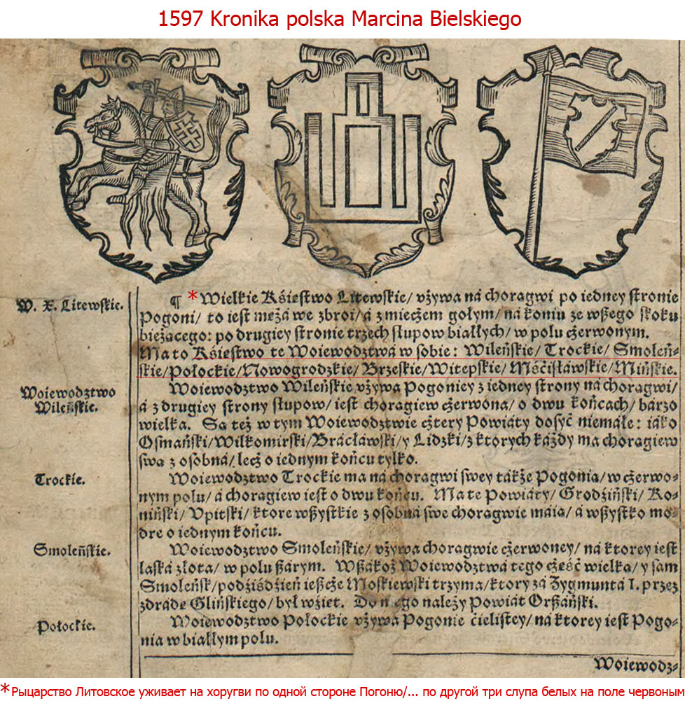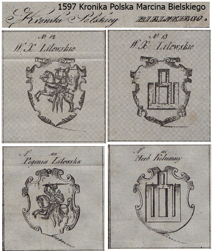 Погоня и Калюмны — "гербы Litewskie". "Рыцарство Литовское уживает на хоругви по одной стороне Погоню/... по другой три слупа белых на поле червоном..."