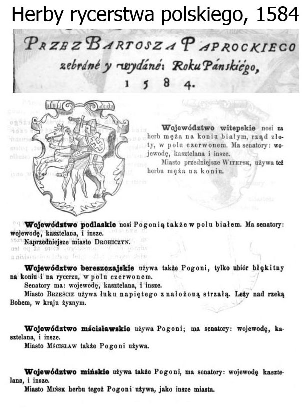 Bartosz Paprocki о Погоне — "Погоня, которая только князьям великим и княжеству оному належит". Использование герба Калюмны он связывал с именем Витеня — "Уживал знак рыцарски, трех слупов, как о том руские хроники говорят"
