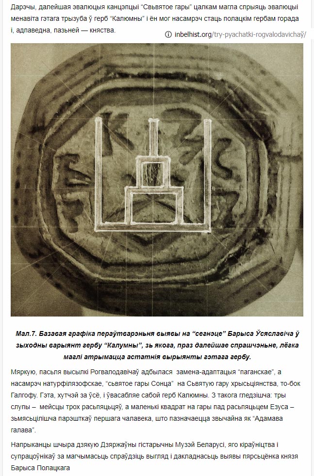 Все кресты Двинских камней изображались с "Голгофой" (характерным постаментом). Внесение "Голгофы" в графику языческих княжеских печатей логично трансформирует ее в Калюмны. Они и стилистически очень близки своим лаконизмом — крест на Рогволодовом камне XII в. и Калюмны XIII в. Кстати — постамент-голгофа и на Калюмнах и на Двинских камнях 2-ступенчатая, в отличие от 3-ступенчатой в трдиции РПЦ.