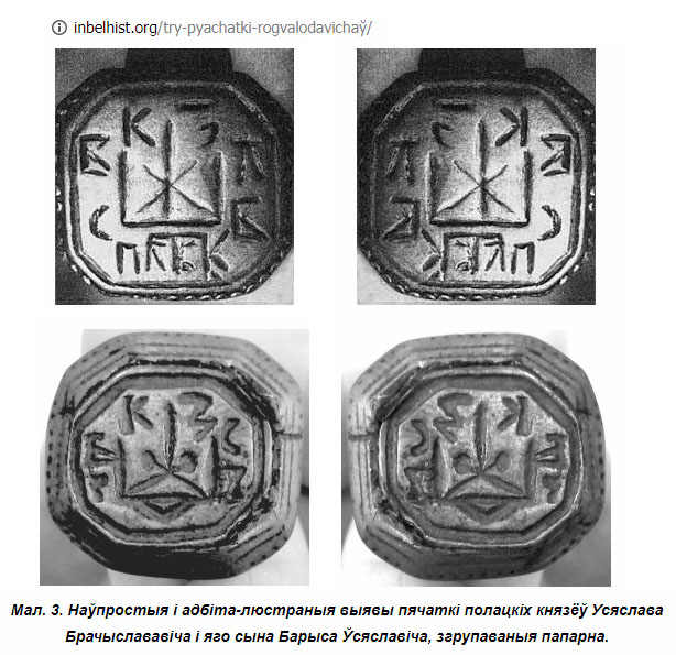 По начертанию знак близок к родовым знакам Киевско-Новгородских Рюриковичей и княжеским печатям XI-XII вв. Всеслава Чародея и его сына Бориса-Рогволода — первого полоцкого князя, имевшего крестильное имя и проводившего крещение Двинских камней (языческих капищ).