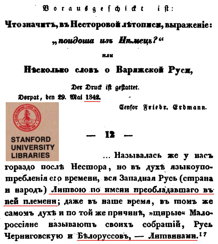 В своей работе "Die Deutschen und die Nachbarstamme" 1837 года Йон Каспер Цойсс, обобщая труды немецких и польских хронистов, локализует расселение литвинов (Litwany) от реки Святая (на севере) до болот Припяти (на юге). Как наследие Полоцкого княжества, отмечается река Березина — "граница Литвы и Руси".