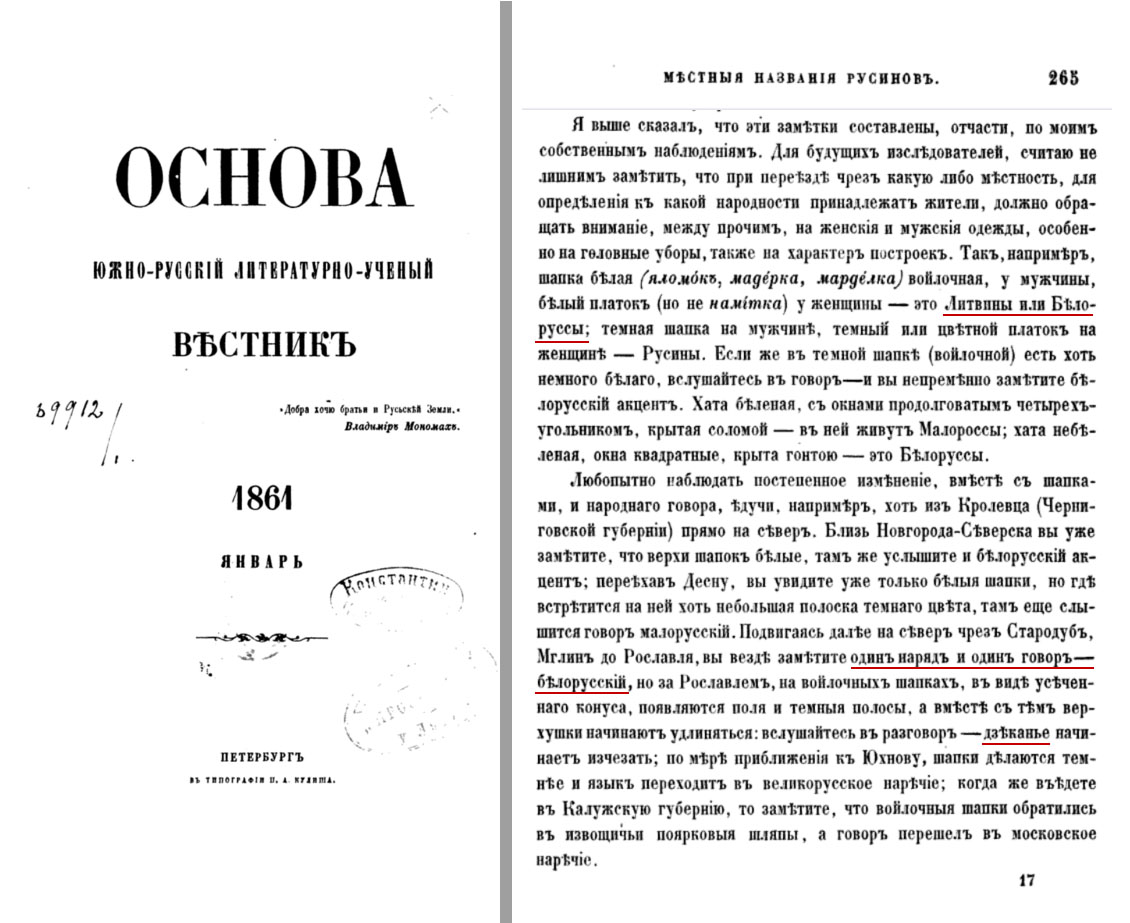[ "Домейко в дневниковых записях о восстании 1830-1831 практически в каждом случае не забывает указать национальную принадлежность того или иного повстанца. Он четко выделял «коронных» (поляков), «жмудинов» (современных литовцев) и «наших литвинов» (современных белорусов)." (с) Архивы Беларуси ][ "ДЗЕКАТЬ — произносить дз вместо д, как белорусы и мазуры… Как не закаивайся литвин, а дзекнет. Только мертвый литвин не дзекнет. Разве лихо возьмет литвина, чтоб он не дзекнул." Толковый словарь живаго великорускаго языка, 1880 г., Владимир Даль ]