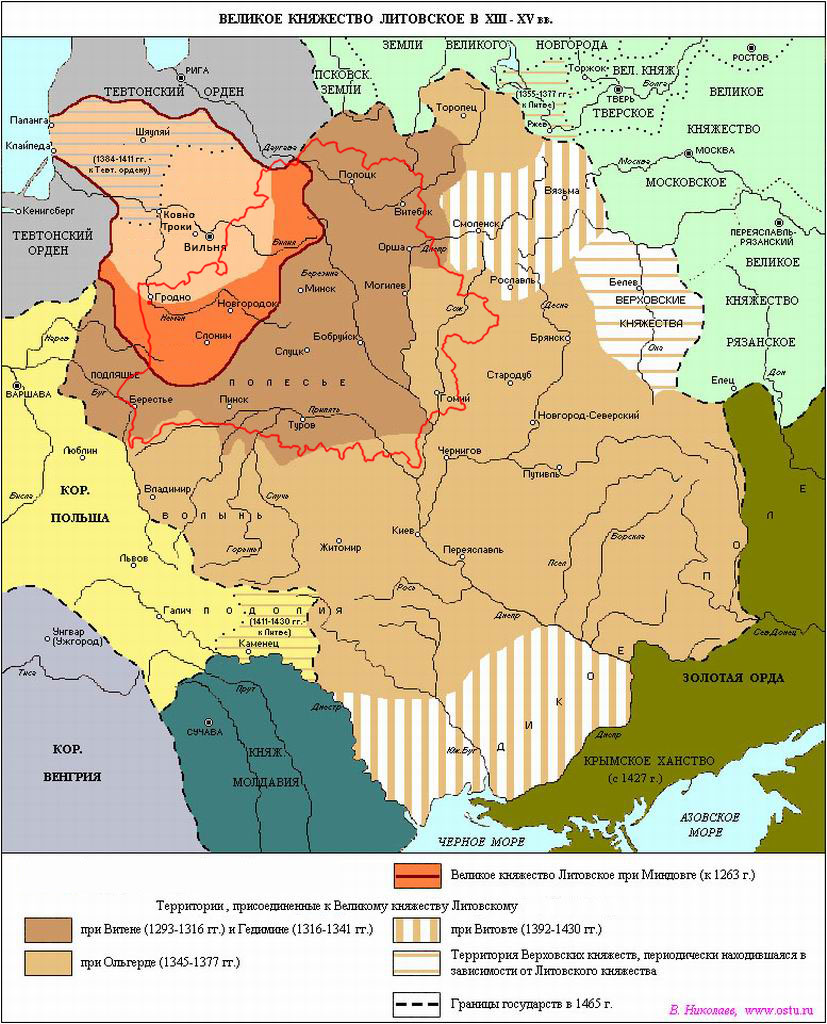 В правление (1316-1341) в. князя Гедимина к Великому княжеству Литовскому мирно присоединились разрозненные княжества и уделы — Полоцк, Гродно и Берестье, Витебск, Минск, Туров и Пинск. Собраны воедино все белорусские земли, кроме Полесья.