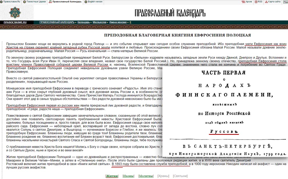 [ Московская церковь до XIX века не имела к ней отношения — Макарьевские соборы XVI в., канонизировавшией русских святых, не считали ее таковой. И хотя ее имя упоминается в "Степенной книге царского родословия" (написанной при Иване Грозном, временно захватившем Полоцк), первая русская служба преподобной Ефросинии была составлена в 1893 году. Поэтому довольно странно читать на православных порталах о том, что "преподобная мати Евфросиния как воин Христов на страже охраняет крайний ЗАПАДНЫЙ рубеж РУССКОЙ земли". Полоцк, в общем-то, находится на ВОСТОКЕ земли, которая называется БЕЛАРУСЬ. ]