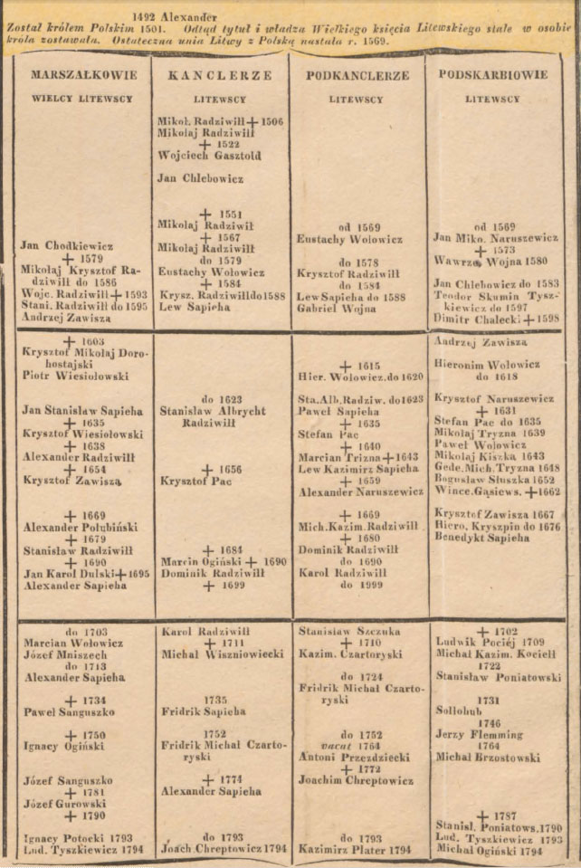 Полный список Великих гетманов, маршалков и канцлеров Литовских, подканцлеров и подскарбиев приведен в "Atlas historyczny, genealogiczny, chronologiczny" A. Le Sage, 1799 .